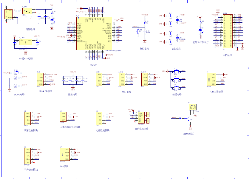 PCB图是由原理图导出,封装很大一部分都是作者自己绘制,不提供封装库,只提供连接好的源文件,可以直接在嘉立创进行打板。两层板,上下覆铜接地。