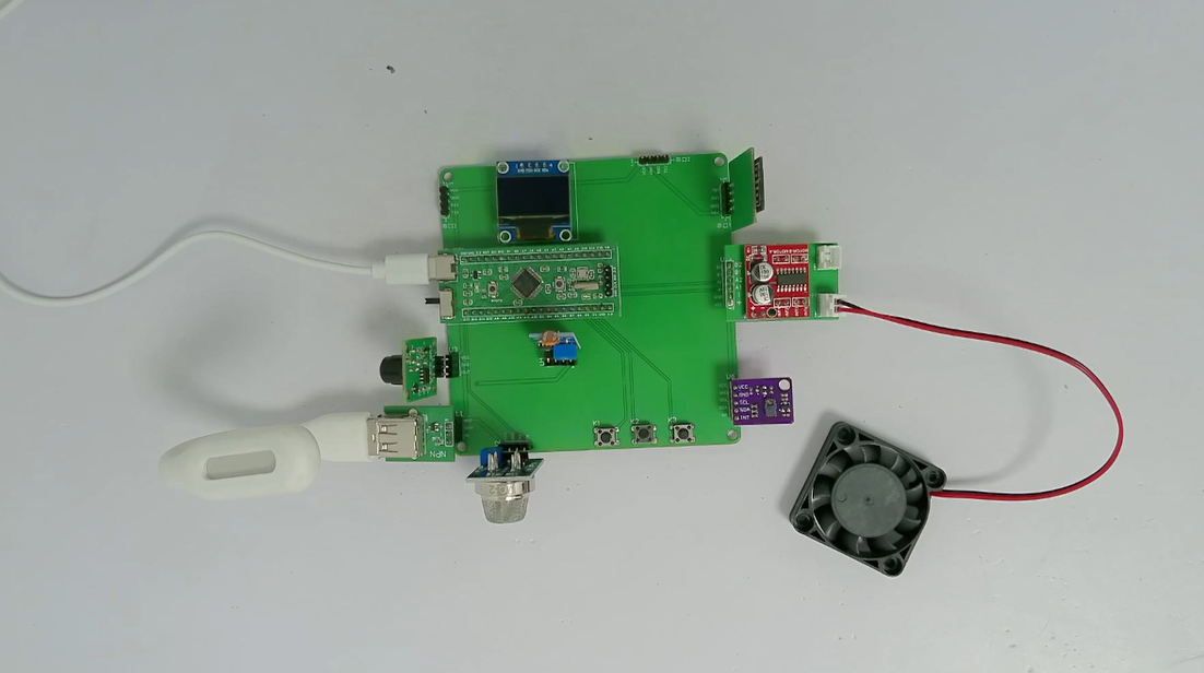 1、通过MQ-2烟雾传感器检测厨房内烟雾浓度,若烟雾浓度小于设定最小阈值,油烟机风扇不工作;若烟雾浓度在设定上下限阈值之间,风扇低速转动;若烟雾浓度在大于设定最大阈值,风扇高速转动