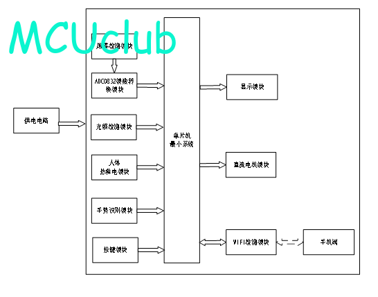 2、通过人体热释电感应模块检测是否有人,通过光照检测模块检测光照,当有人且光照过低,则自动打开照明