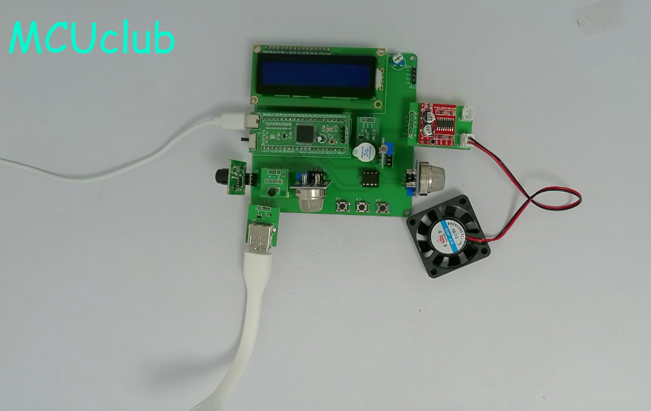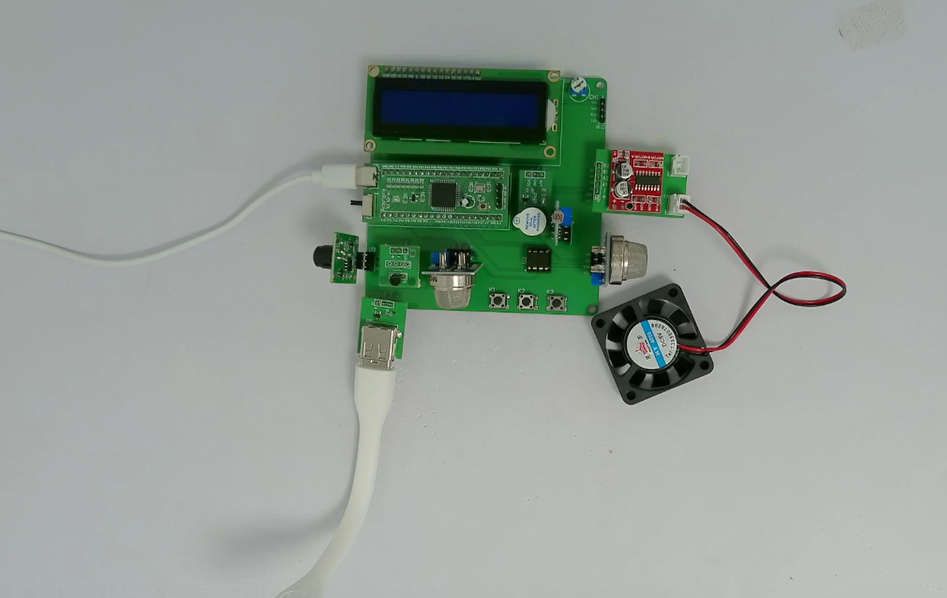 1、通过MQ-2烟雾传感器检测厨房内烟雾浓度,若烟雾浓度小于设定最小阈值,油烟机风扇不工作;若烟雾浓度在设定上下限阈值之间,风扇低速转动;若烟雾浓度在大于设定最大阈值,风扇高速转动
