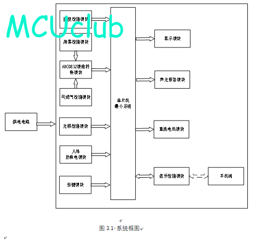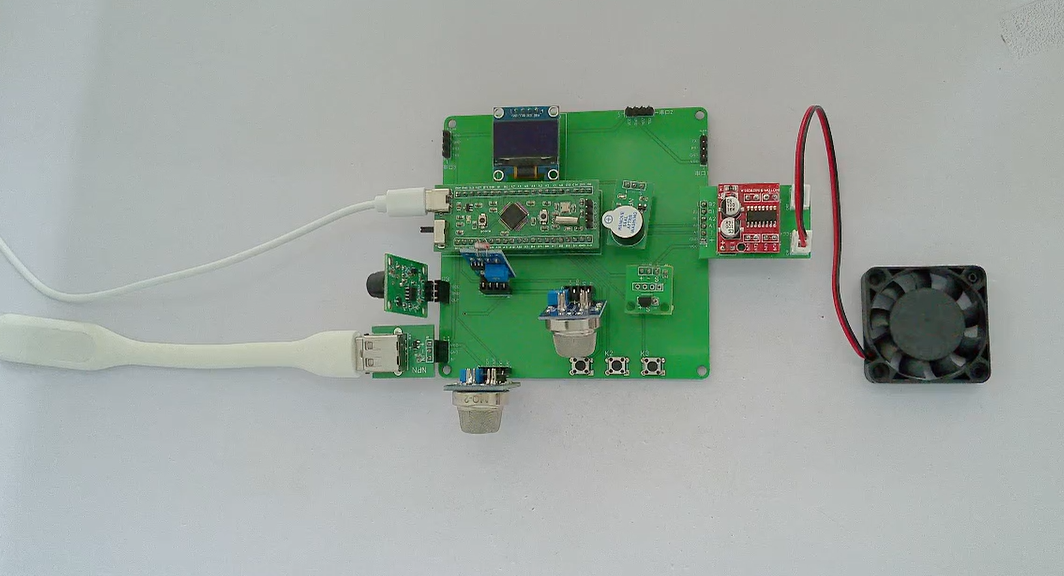 1、通过MQ-2烟雾传感器检测厨房内烟雾浓度,若烟雾浓度小于设定最小阈值,油烟机风扇不工作;若烟雾浓度在设定上下限阈值之间,风扇低速转动;若烟雾浓度在大于设定最大阈值,风扇高速转动