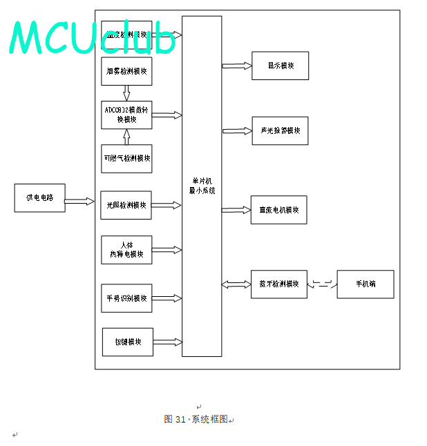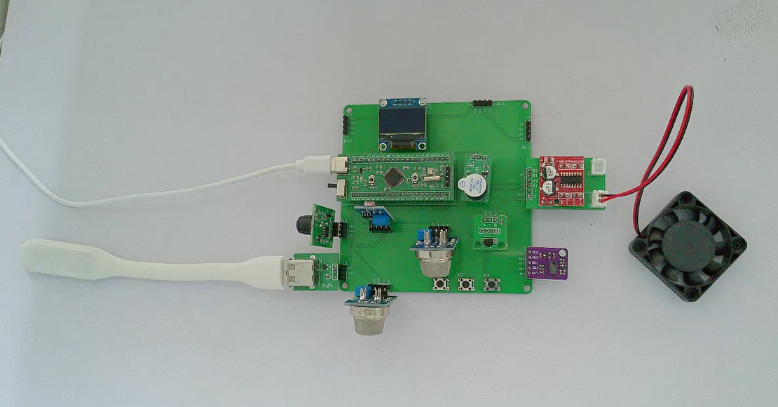 1、通过MQ-2烟雾传感器检测厨房内烟雾浓度,若烟雾浓度小于设定最小阈值,油烟机风扇不工作;若烟雾浓度在设定上下限阈值之间,风扇低速转动;若烟雾浓度在大于设定最大阈值,风扇高速转动