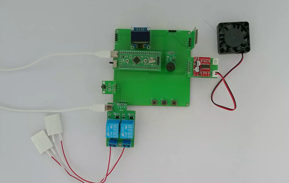 1、通过按键控制吹风机的加热模式,包括停止、低温、高温(两个继电器)