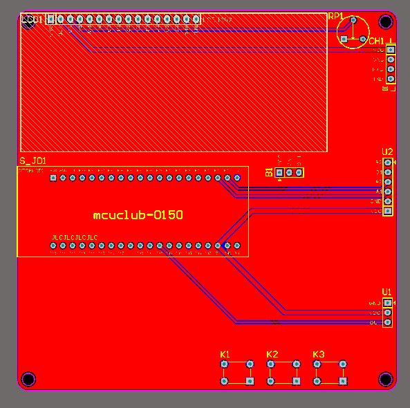 PCB图是由原理图导出,封装很大一部分都是作者自己绘制,不提供封装库,只提供连接好的源文件,可以直接在嘉立创进行打板。两层板,上下覆铜接地。