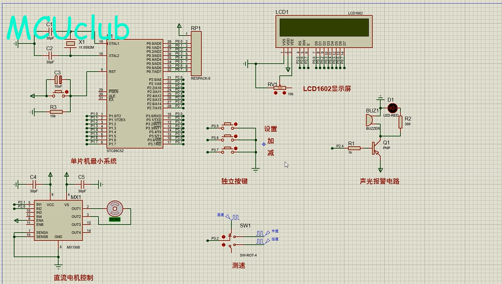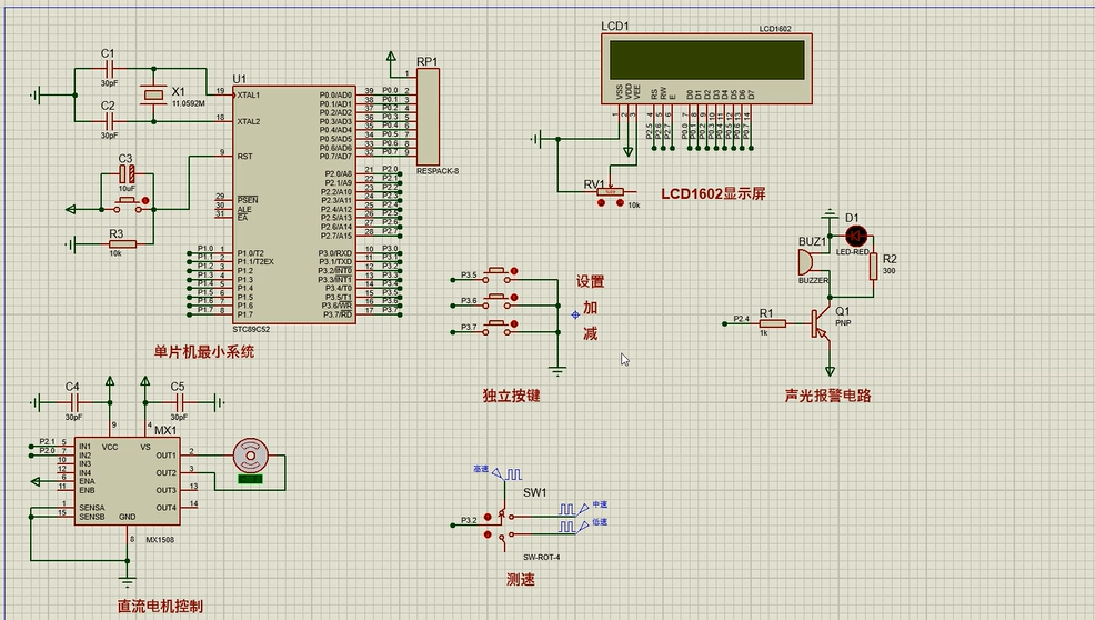 2、通过霍尔模块测量速度值,当速度值大于设置最大值,进行声光报警