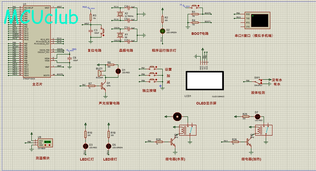 1、通过防水式DS18B20检测水温,当打开加热时,温度小于设置最小值,进行自动加热,直到加热到100℃停止