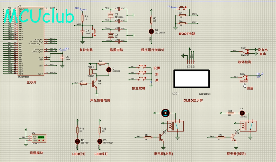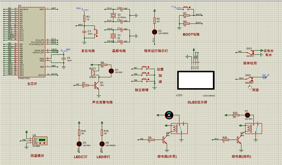2、通过液位检测模块检测是否有水,如果没有水,则自动停止加热,防止干烧,并声光报警提醒换水
