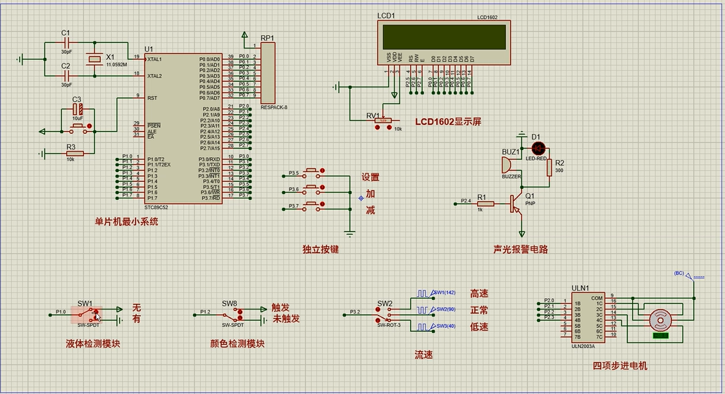 3、通过红外对管检测液体流速,若流速大于设定最大值,则步进电机逆时针旋转10°,挤压输液管,若小于设定最小值,则步进电机顺时针旋转10°,舒张输液管