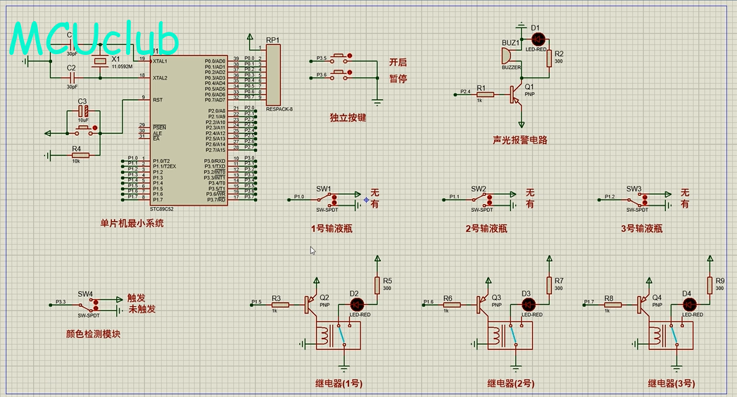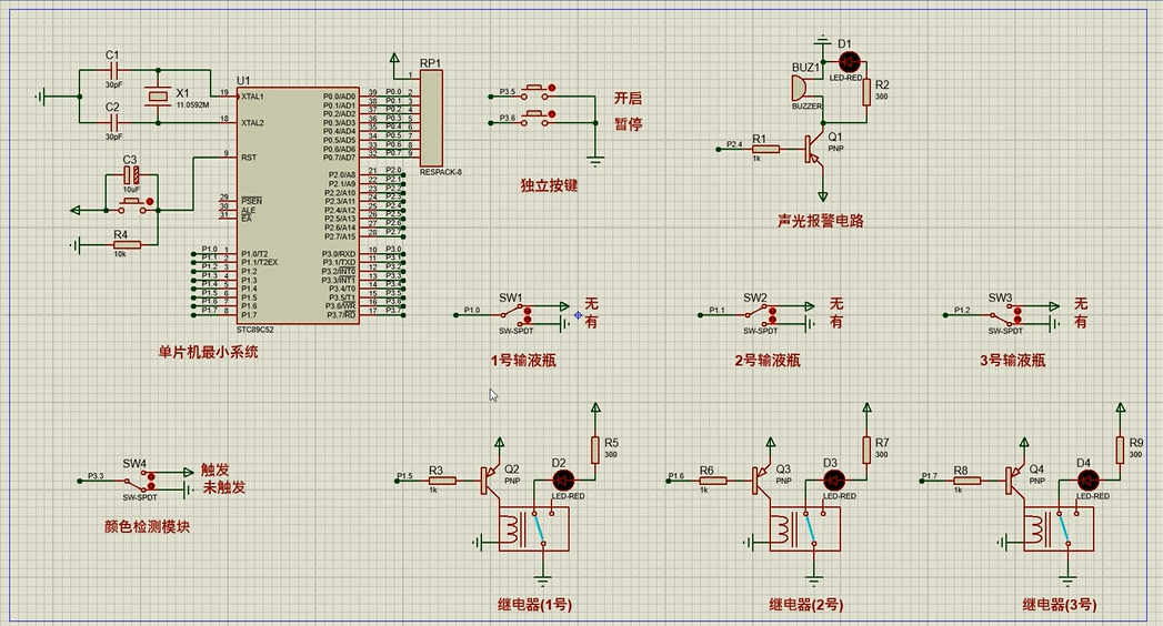 1、通过3个液位检测模块检测3个输液瓶是否有液体