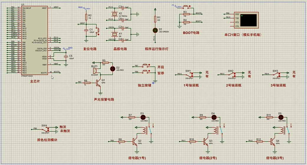 1、通过3个液位检测模块检测3个输液瓶是否有液体