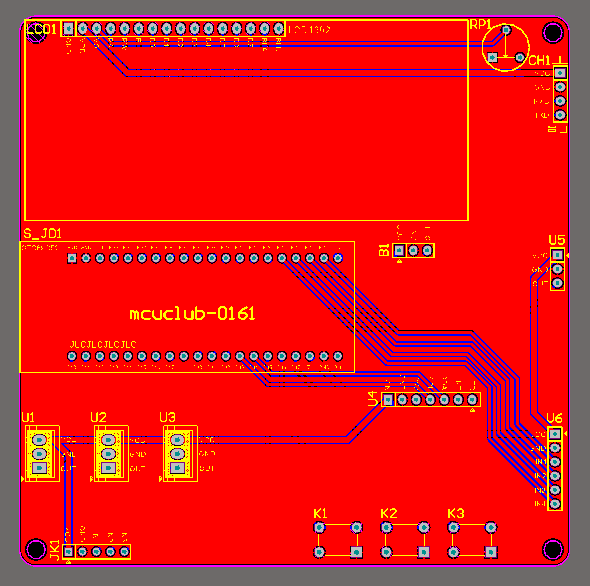 PCB图是由原理图导出,封装很大一部分都是作者自己绘制,不提供封装库,只提供连接好的源文件,可以直接在嘉立创进行打板。两层板,上下覆铜接地。
