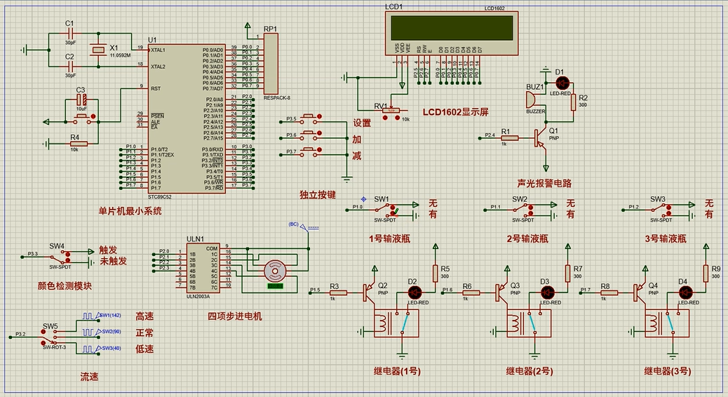 6、通过按键可设置各个输液瓶的滴速,通过红外对管检测液体流速,若流速大于设定最大值,则步进电机逆时针旋转45°,挤压输液管,若小于设定最小值,则步进电机顺时针旋转45°,舒张输液管。当流速处于上下值之间时,可通过按键调节流速(调节电机角度)