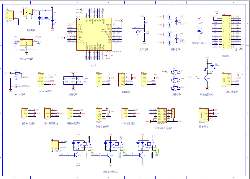 PCB图是由原理图导出,封装很大一部分都是作者自己绘制,不提供封装库,只提供连接好的源文件,可以直接在嘉立创进行打板。两层板,上下覆铜接地。