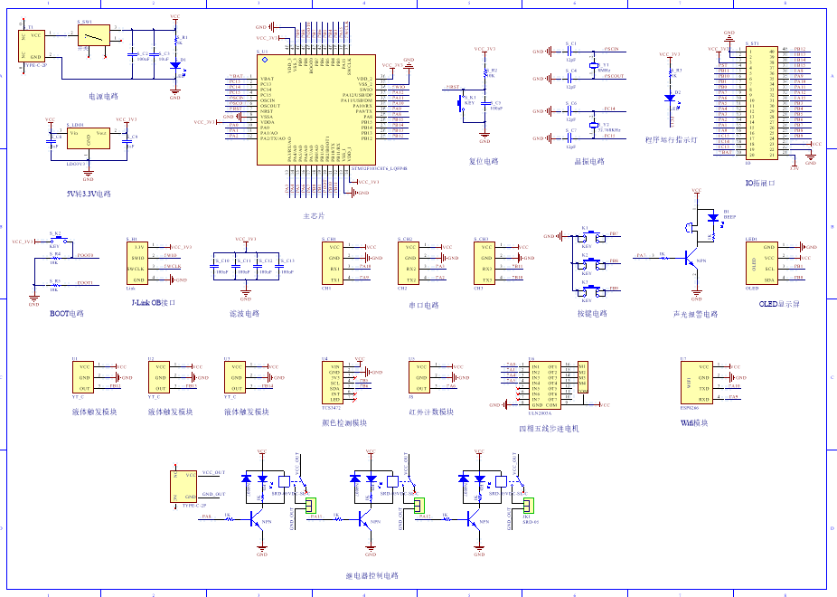 PCB图是由原理图导出,封装很大一部分都是作者自己绘制,不提供封装库,只提供连接好的源文件,可以直接在嘉立创进行打板。两层板,上下覆铜接地。