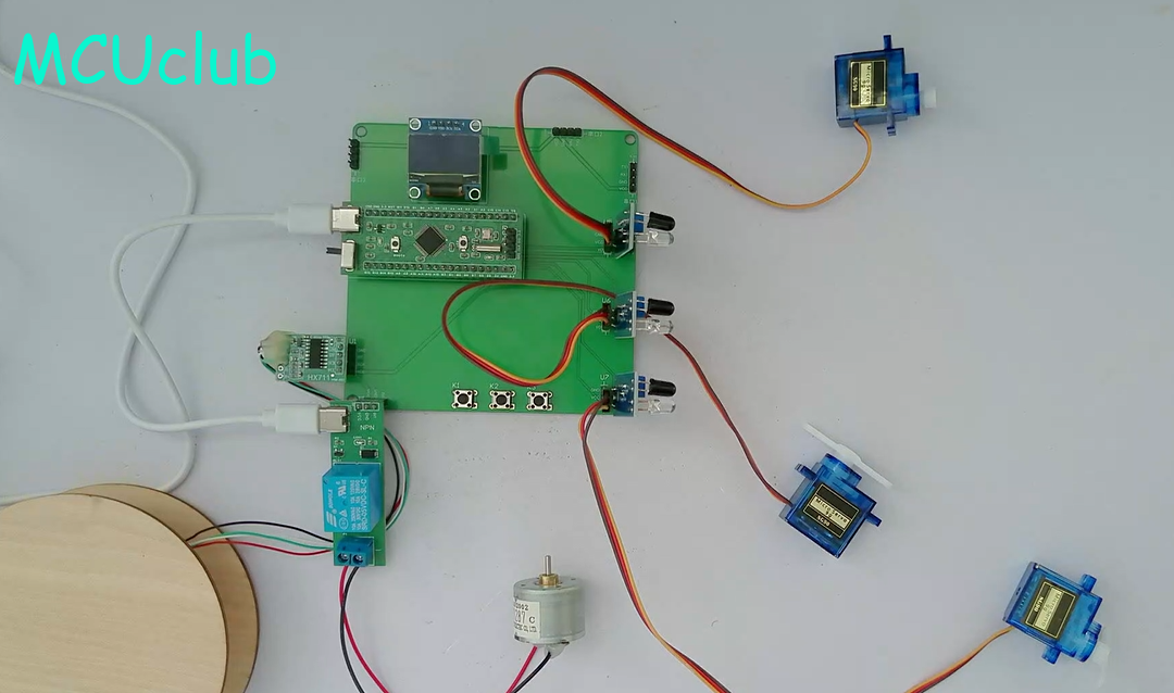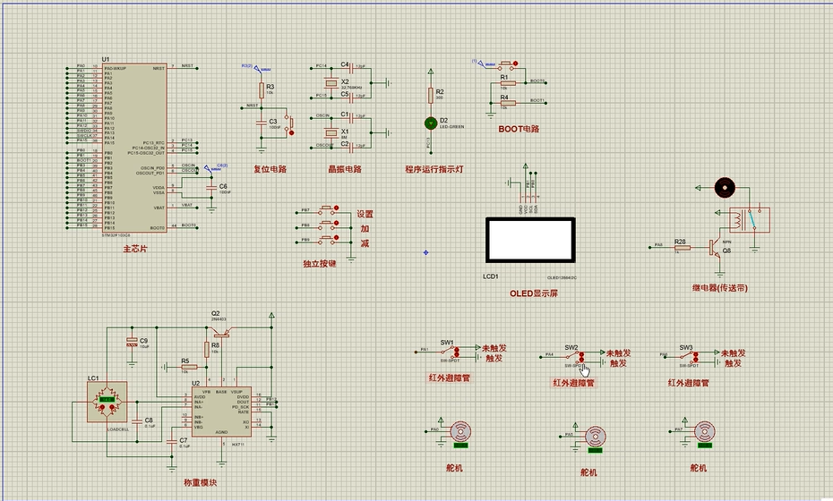 2、通过按键划分三种等级的重量,当物体重量处在哪个等级时,物体被传送到该重量对应的红外避障管触发,此时启动舵机将物体击到对应的筐中,并且记录对应筐中的数量