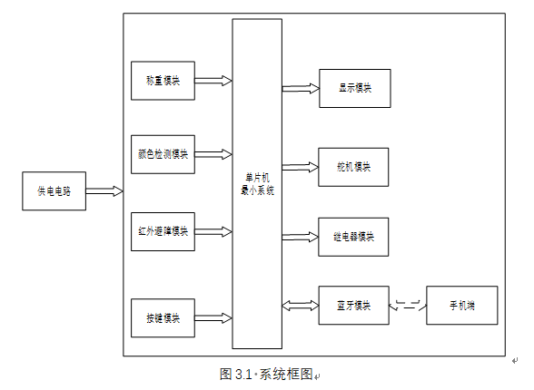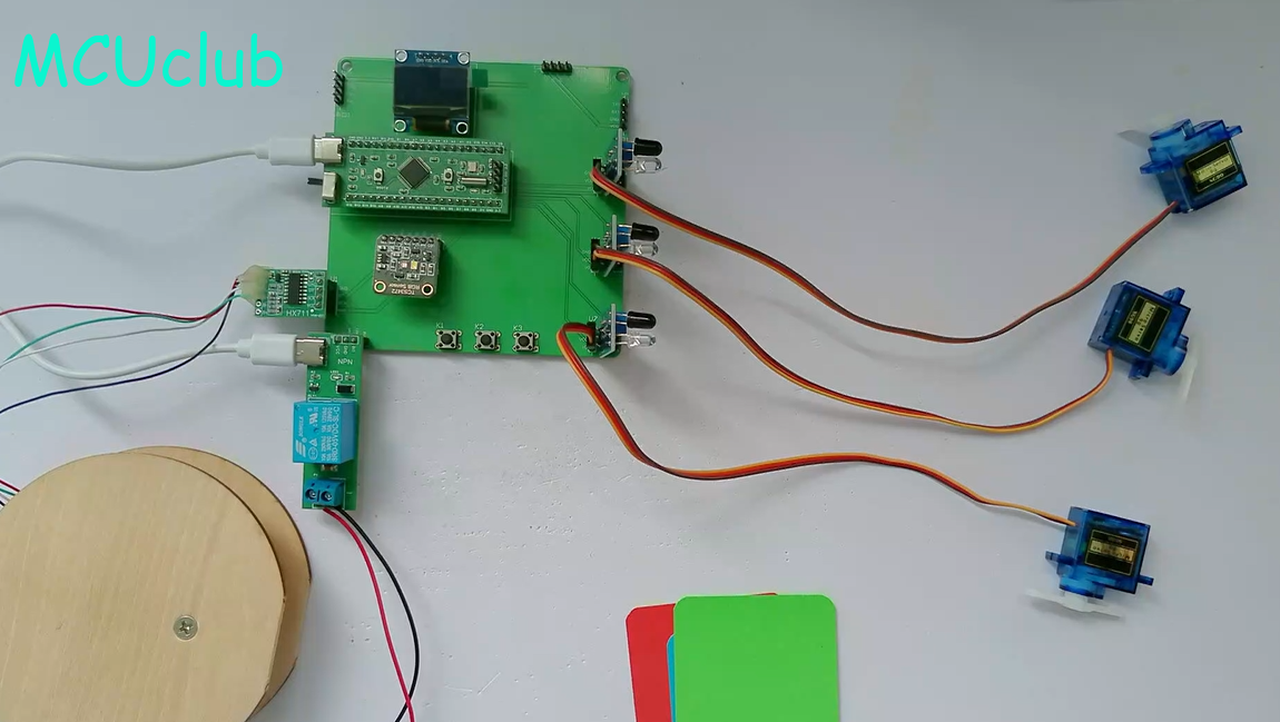 2、通过颜色检测模块检测颜色,可识别出三种颜色(红、绿、蓝),物体被传送到该颜色对应的红外避障管触发,此时启动舵机将物体击到对应的筐中,并且记录对应筐中的数量