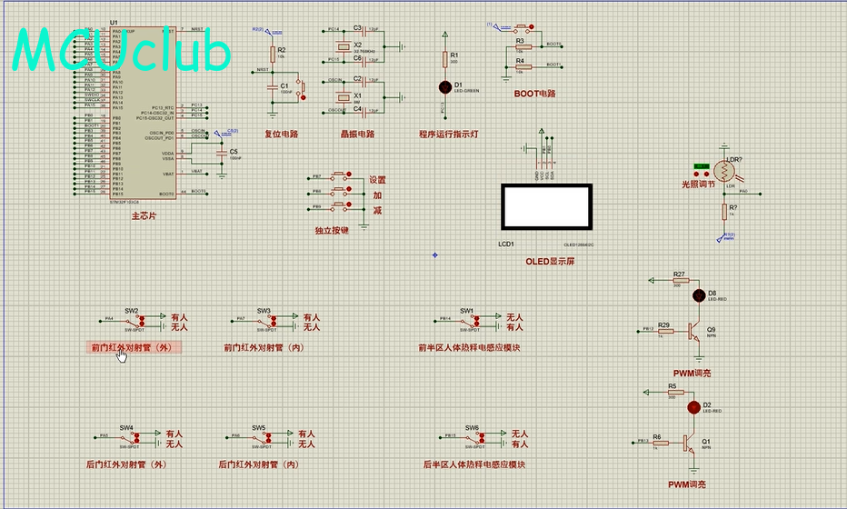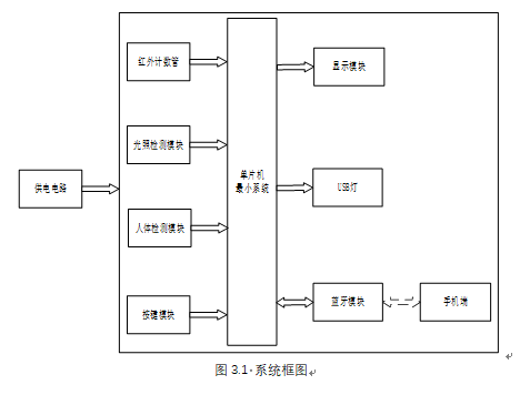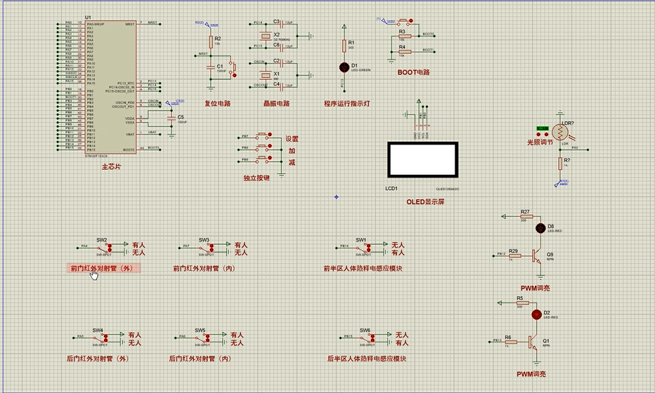 2、通过光照检测模块检测光照值,当光照值低于设置最大值大于设置最小值且人数不为0且触发人体热释电感应模块,则根据光照自动调节灯光亮度;当光照值低于设置最小值且人数不为0且触发人体热释电感应模块,灯光亮度最亮(两个人体热释电,两个灯,触发哪个开哪个,模拟教室的前半区和后半区)