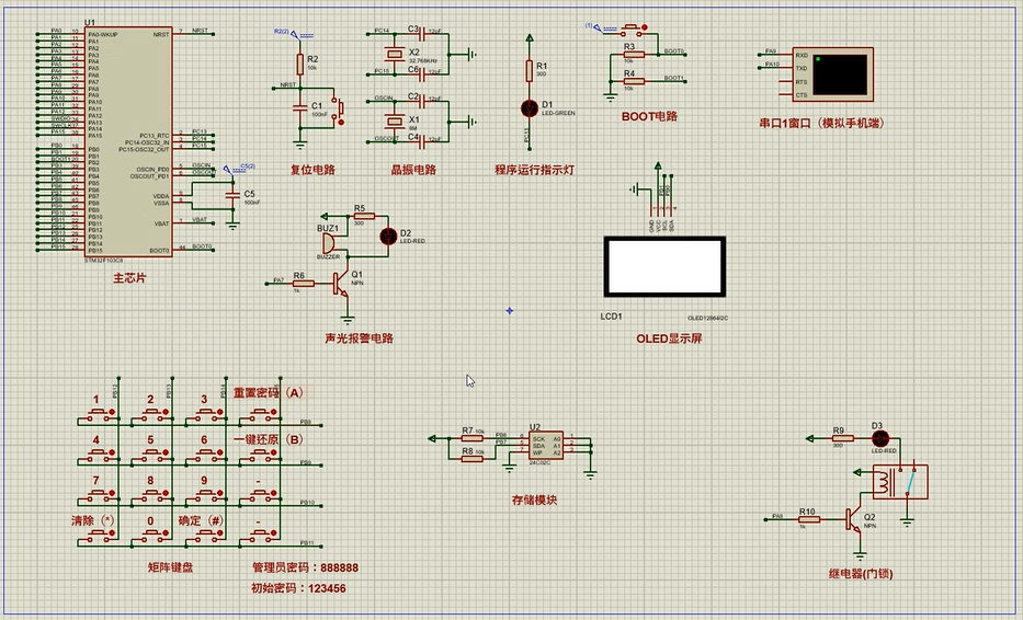1、通过4*4的矩阵键盘中的0-9为数字键,*为删除键,#为确定键,A为重置密码键,B为一键还原密码键