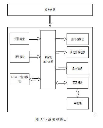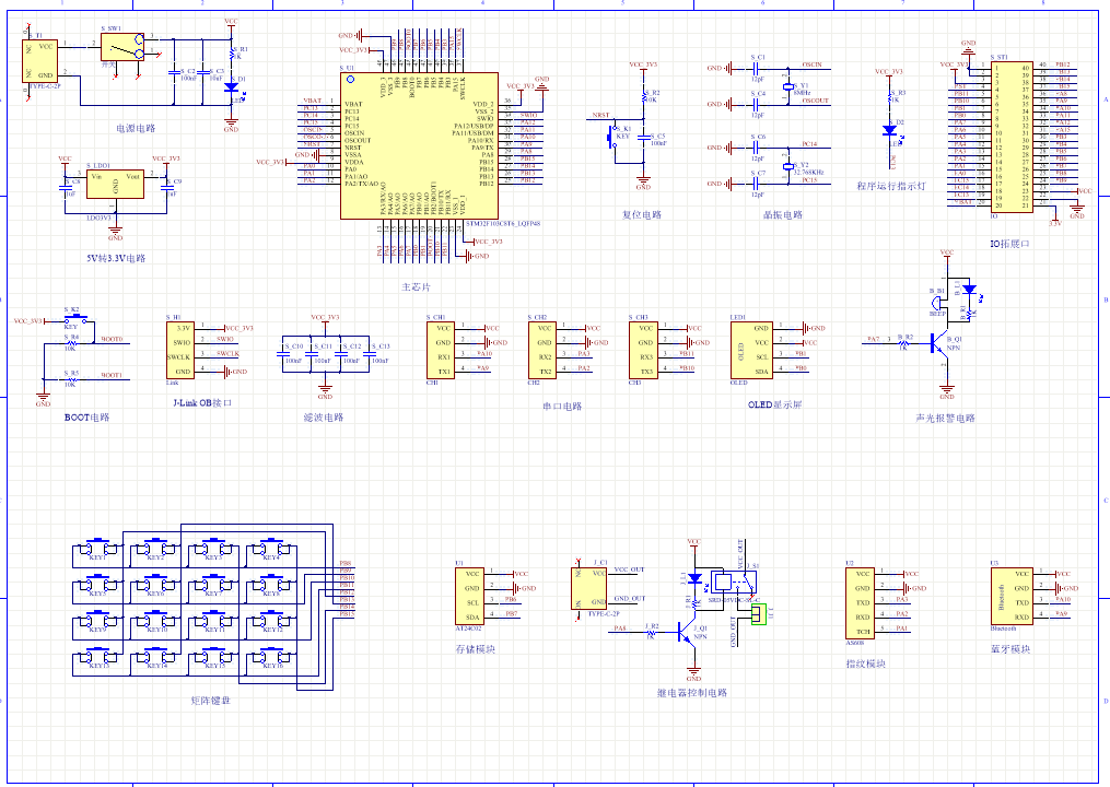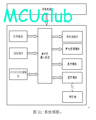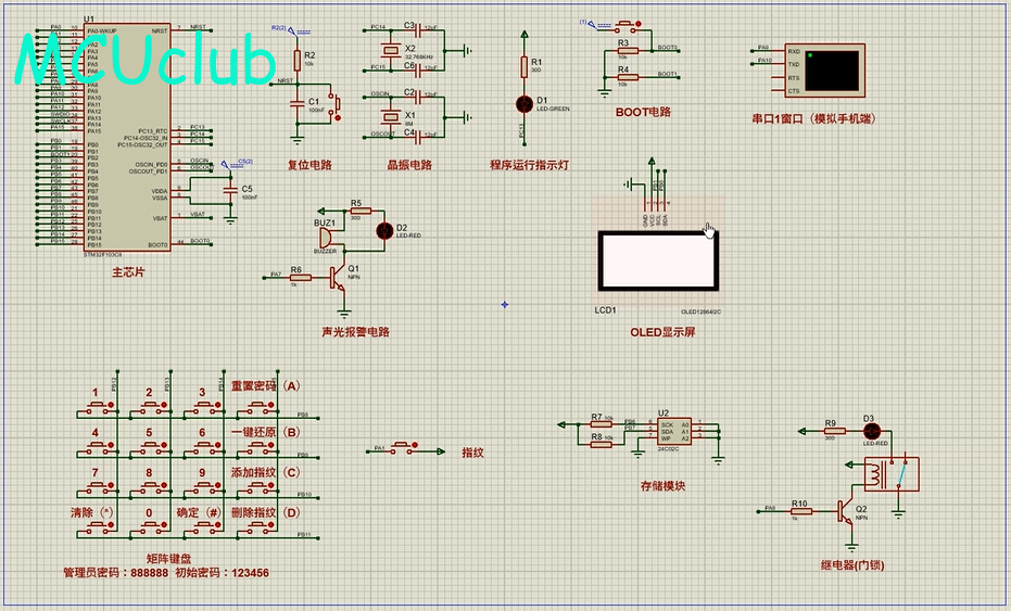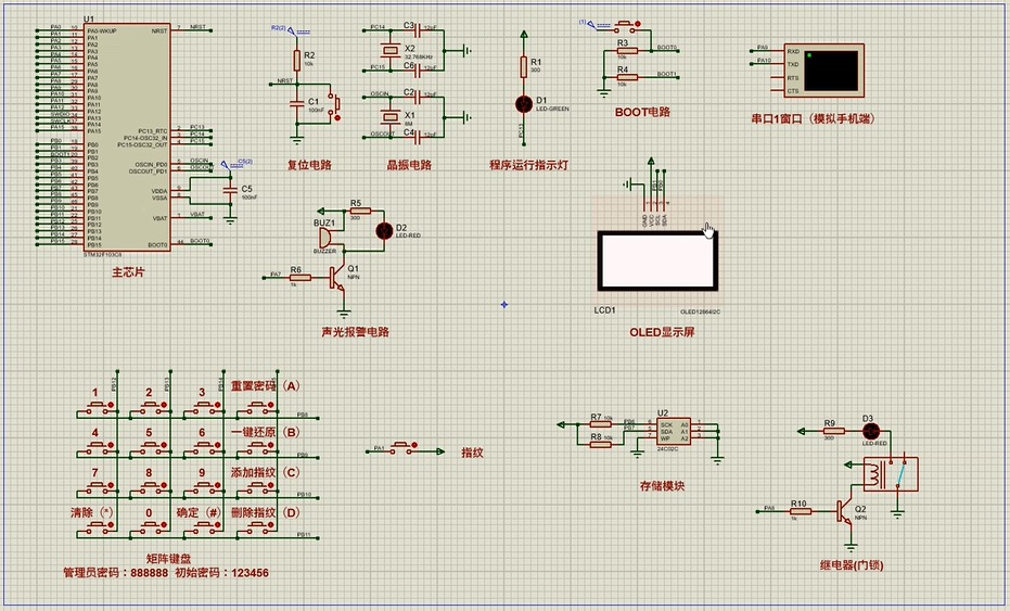 1、通过4*4的矩阵键盘中的0-9为数字键,*为删除键,#为确定键,A为重置密码键,B为一键还原密码键,C为添加指纹,D为删除指纹