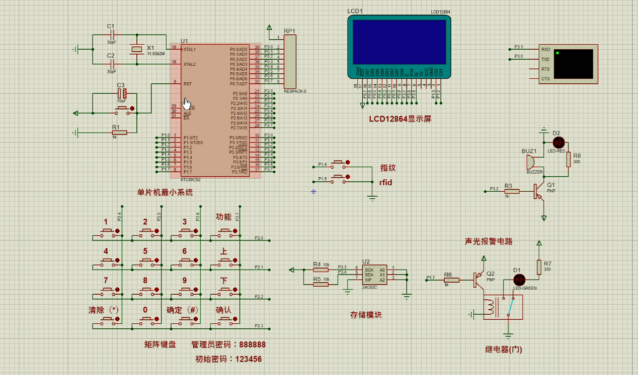 11、通过LCD12864显示屏显示输入的密码(*号表示,防止被偷看),另外,输入密码可以前后加入扰乱码,只要包含正确密码即可