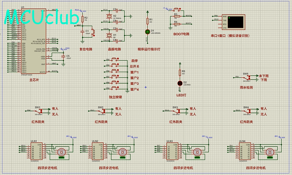 5、通过1个按键模拟启动车辆,并通过一个LED灯指示,只有当启动车辆时,才可以开关车窗,否则当车辆熄火时,自动关闭所有车窗