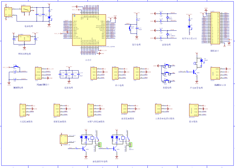 PCB图是由原理图导出,封装很大一部分都是作者自己绘制,不提供封装库,只提供连接好的源文件,可以直接在嘉立创进行打板。两层板,上下覆铜接地。
