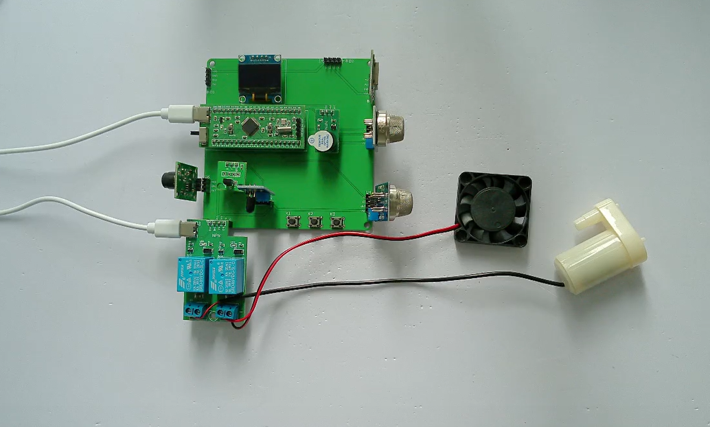 3、通过MQ-5检测当前可燃气体浓度,如果气体浓度大于设置最大值,通过继电器控制风扇通风,并声光报警