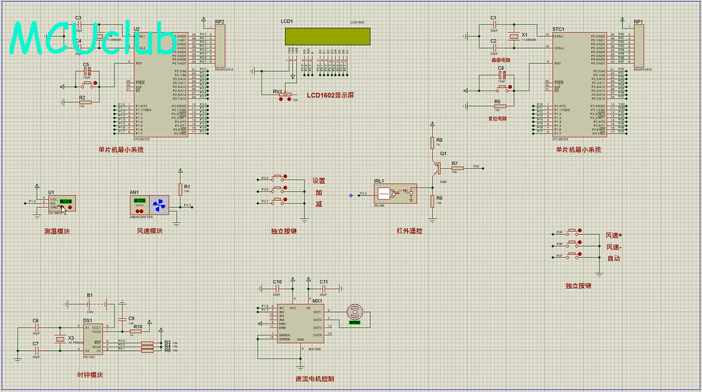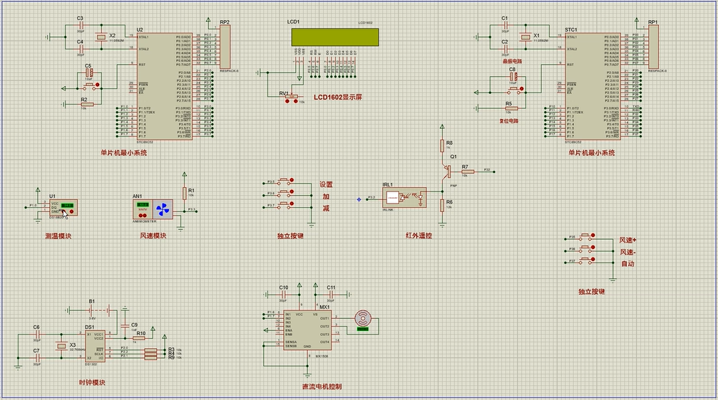 1、通过温度传感器检测当前环境的温度,检测到温度小于设置的最小值控制暖风机高速旋转,加热到达温度大于设置的最大值关闭暖风机,在上下限范围之内低速旋转;