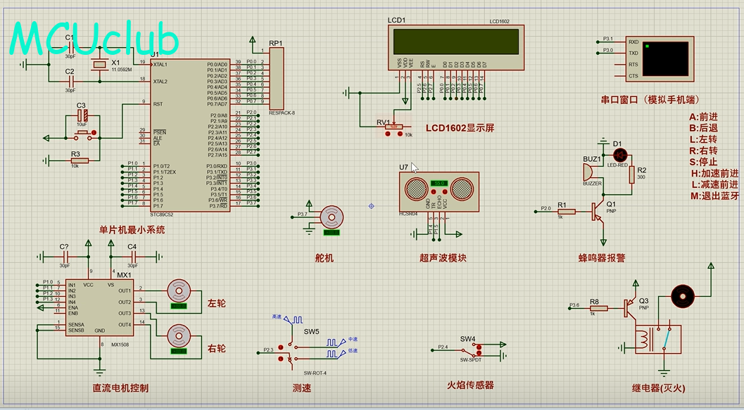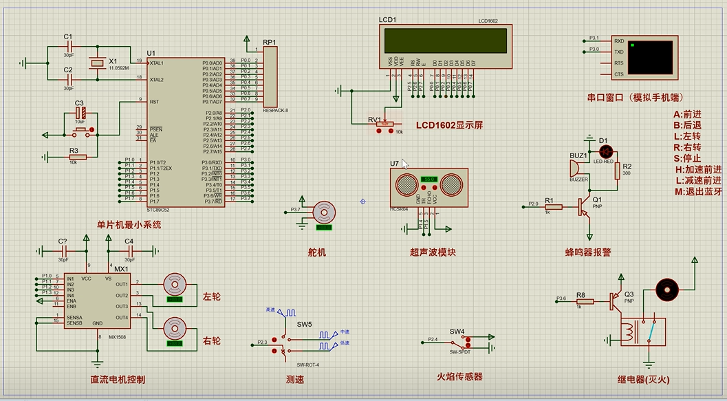 6、通过蓝牙控制小车前进、后退、左转、右转、停止、加速向前、减速向前,通过超声波检测前方障碍物,当检测到障碍物距离小于50cm大于30cm,蜂鸣器报警,当检测到障碍物距离小于等于30cm时自动避开障碍物