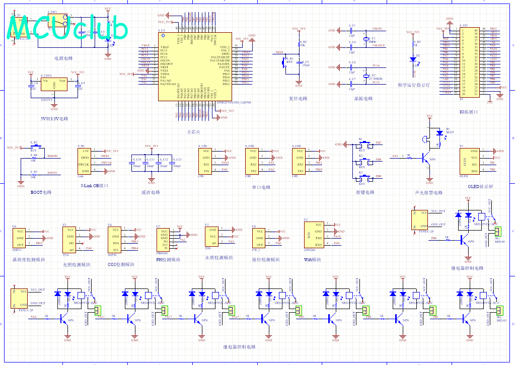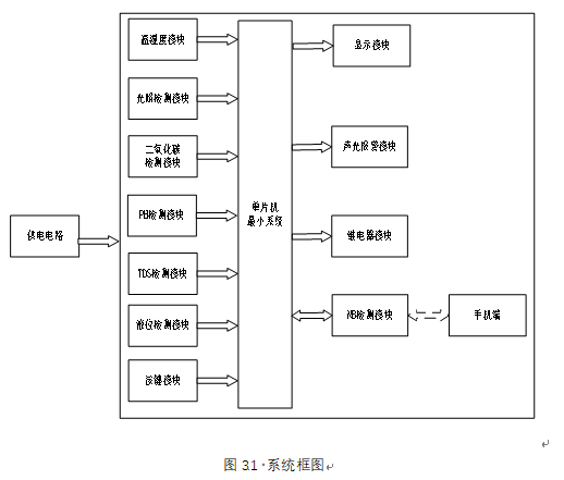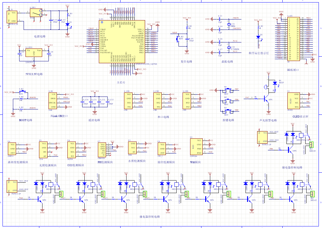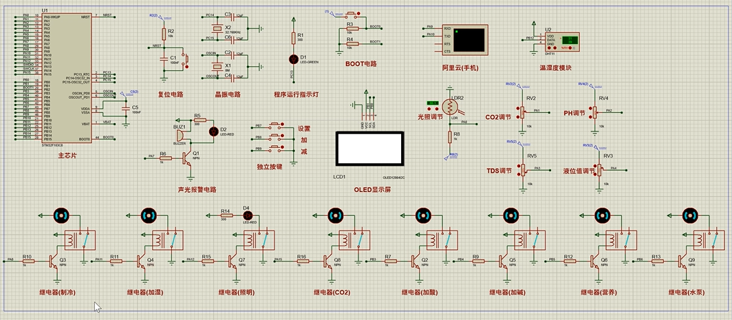 4、通过PH检测模块检测当前环境的PH值,检测到PH过高,加热酸,同时声光报警,检测到PH过低,加入碱,同时声光报警;