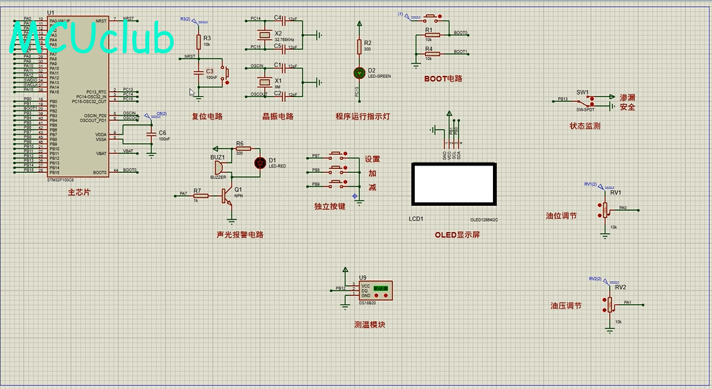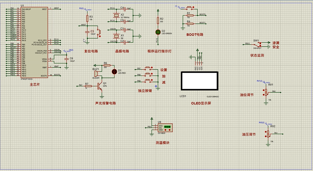2、通过液体检测模块检测油位,当油位低于设置最小值进行声光报警提醒