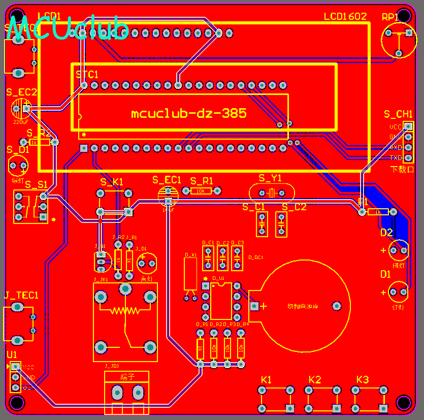 注意:PCB图中间有一个项目编号,隐藏在单片机底座下,插入单片机后不会看到。如果想截没有项目编号的PCB图,可在PCB源文件中点击删除。另外,如果想在实物PCB板上加自己的信息(比如日期、学号、姓名等),可联系客服。