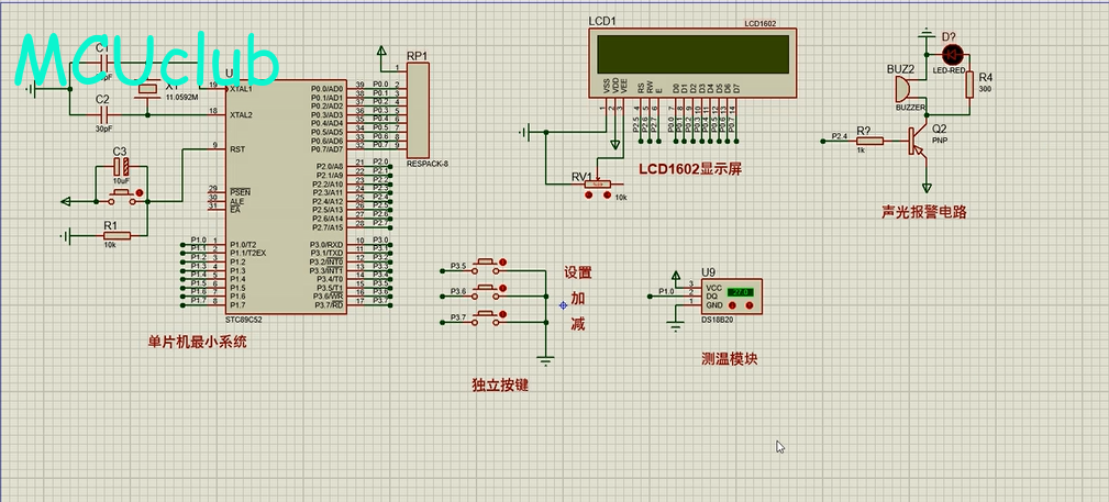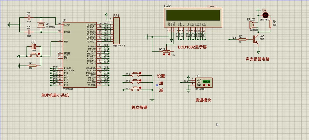 1、通过DS18B20测量温度,当温度不在设定的上下限值之内时,进行声光报警提醒