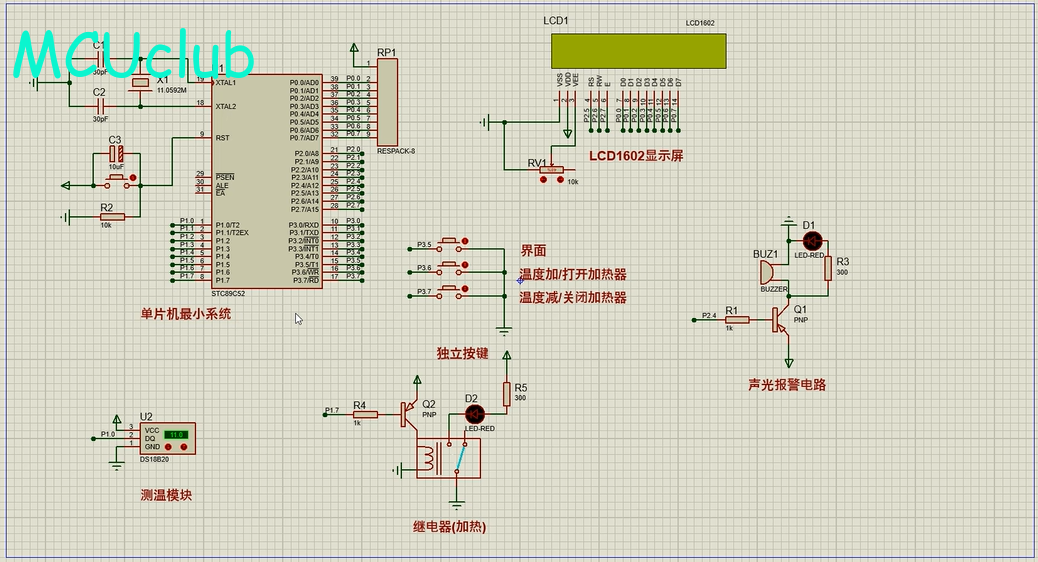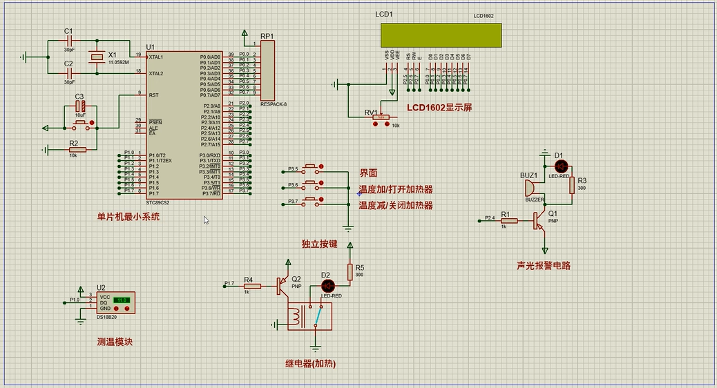 1、通过DS18B20测量温度,当温度低于设置最小值时,进行加热,直到温度大于设置最大值时停止,同时进行声光报警提醒
