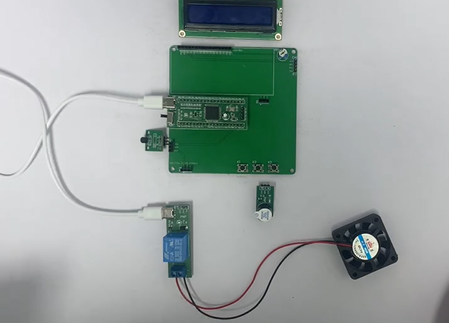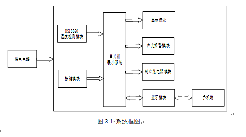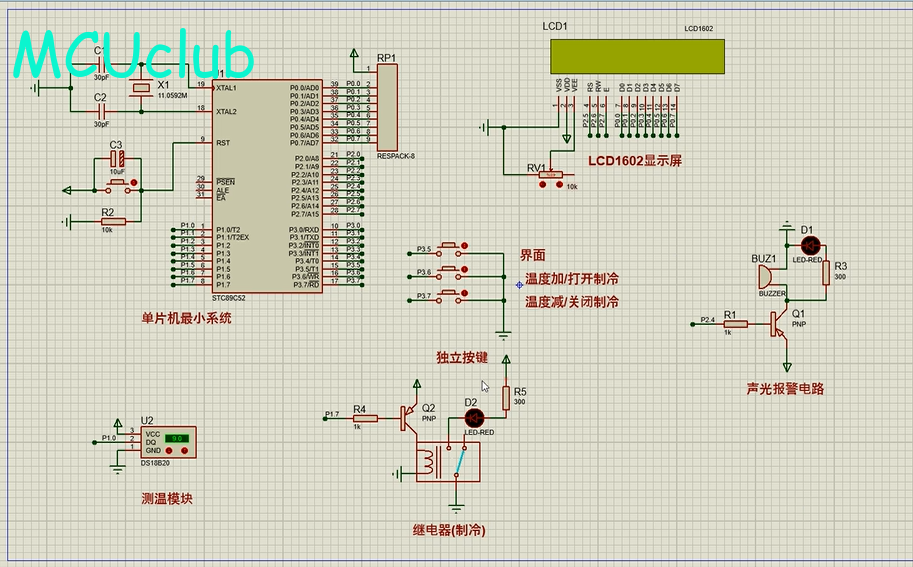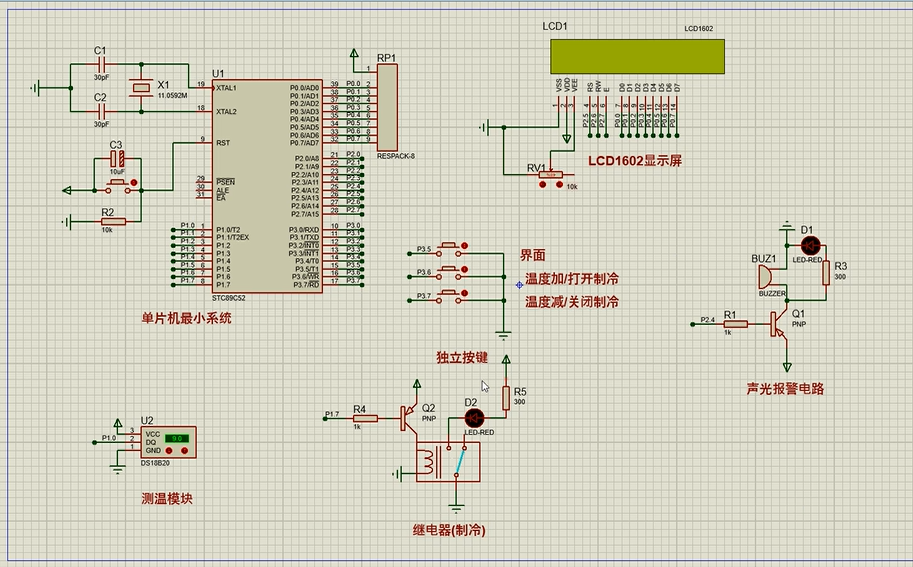 1、通过DS18B20测量温度,当温度高于设置最大值时,进行制冷,直到温度小于设置最小值时停止,同时进行声光报警提醒