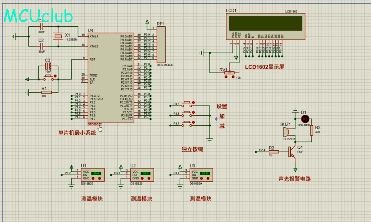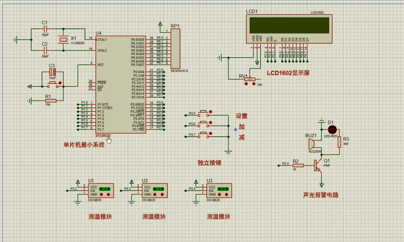 1、通过三路DS18B20测量温度,当任意一路温度不在设定的上下限值之内时,进行声光报警提醒