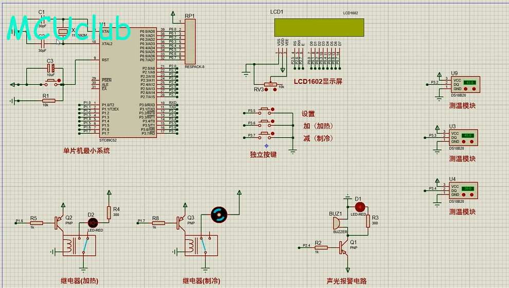 1、通过三路DS18B20测量温度,当平均温度高于设置最大值时,进行制冷,当平均温度低于设置最小值时进行加热,同时进行声光报警提醒