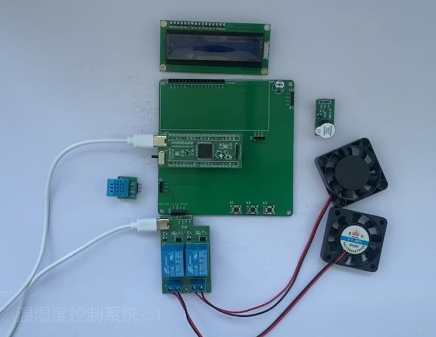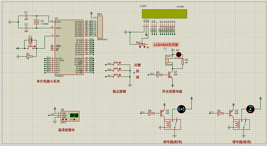 1、通过DHT11测量温湿度,当温度高于设置最大值时,进行制冷,直到温度小于设置最小值时停止;当湿度高于设置最大值时,进行除湿,直到湿度小于设置最小值时停止;同时进行声光报警提醒