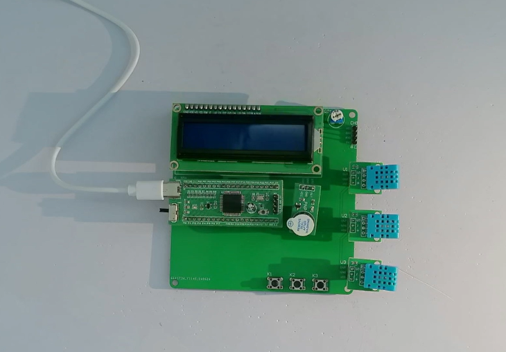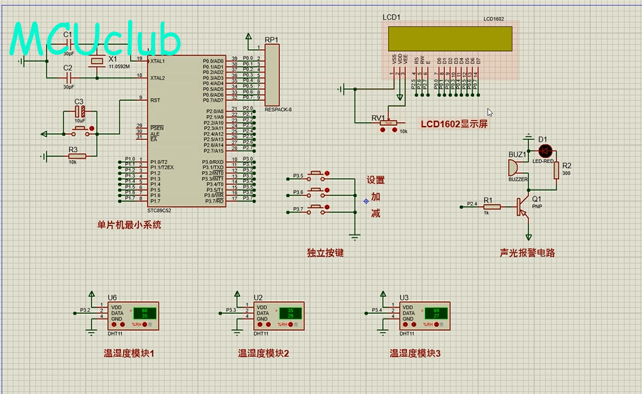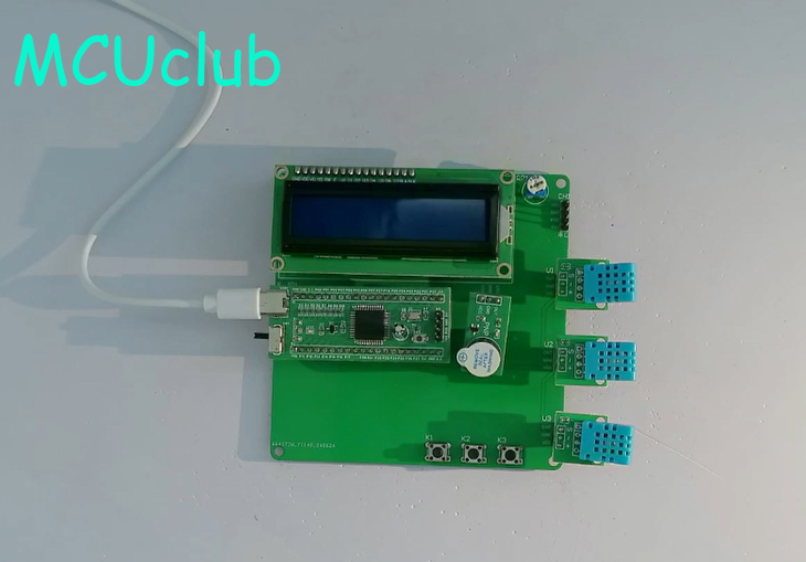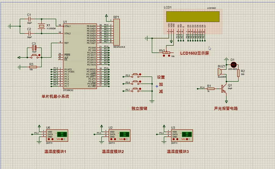 1、通过三路DHT11测量温湿度,当任意一路温湿度不在设定的上下限值之内时,进行声光报警提醒