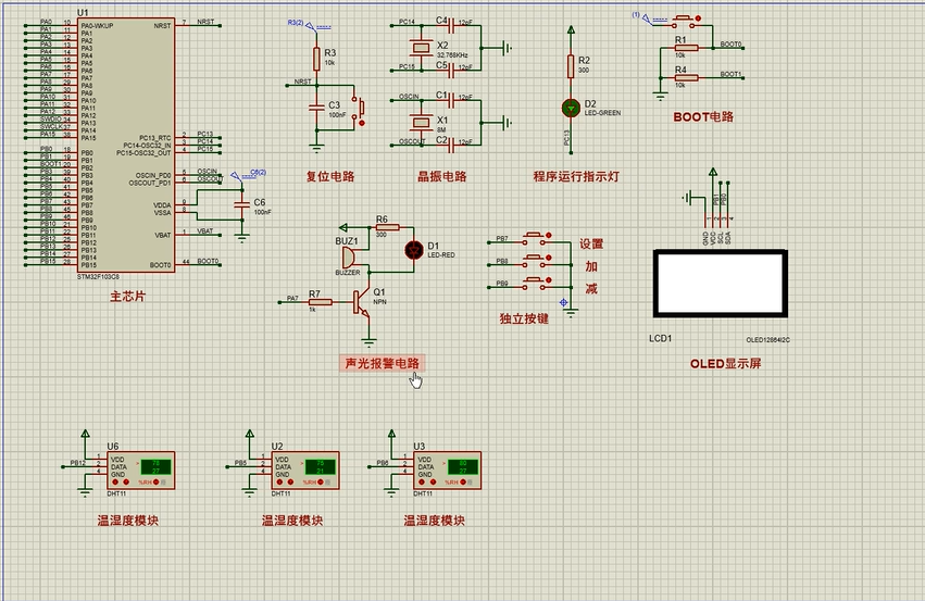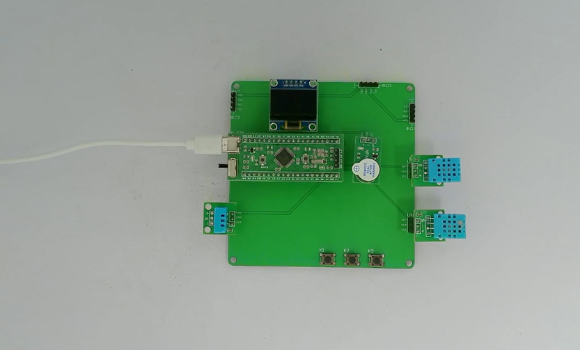 1、通过三路DHT11测量温湿度,当任意一路温湿度不在设定的上下限值之内时,进行声光报警提醒