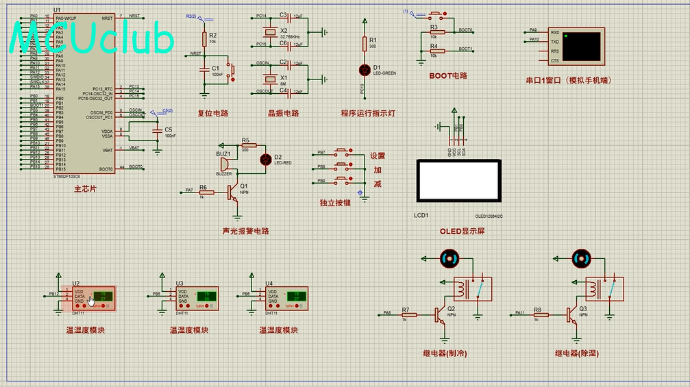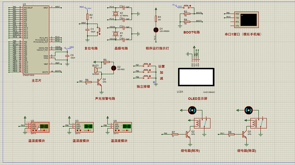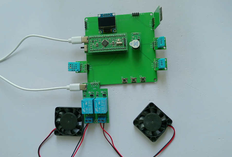 1、通过三路DHT11测量温湿度,当任意一路温度高于设置最大值时,进行制冷,直到三路温度都小于设置最小值时停止;当任意一路湿度高于设置最大值时,进行除湿,直到三路湿度都小于设置最小值时停止;同时进行声光报警提醒