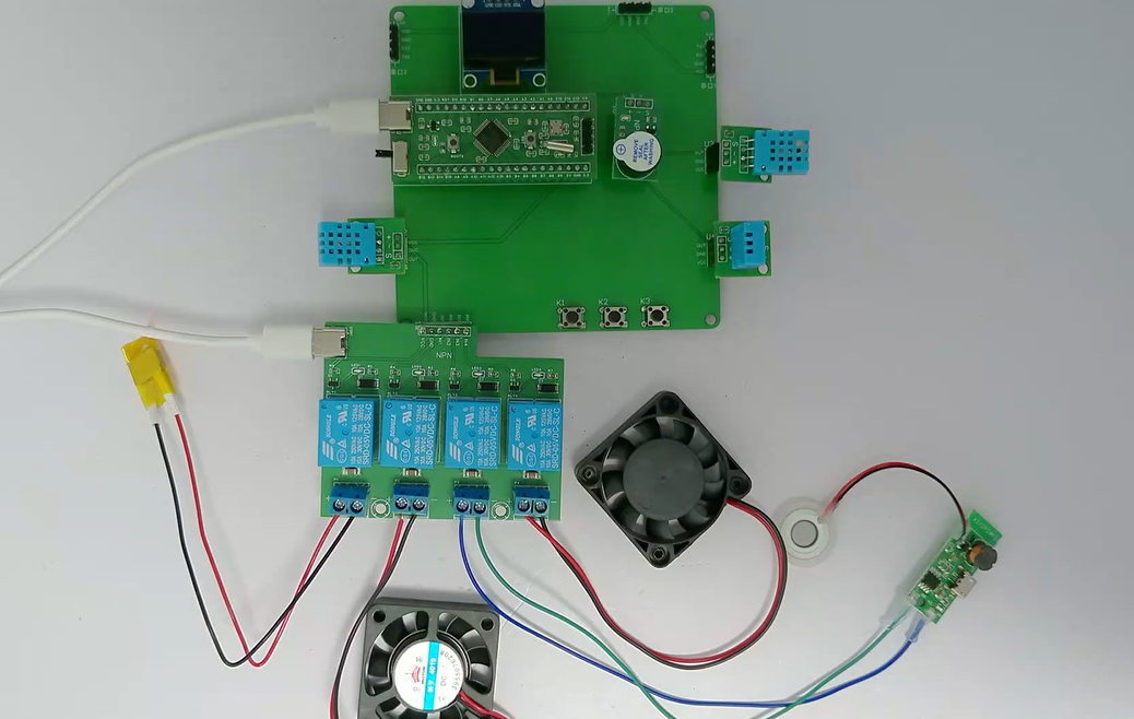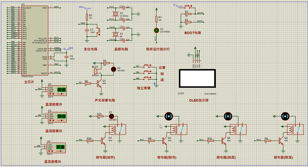 1、通过三路DHT11测量温湿度,当平均温度不在设置的范围内时,进行相应的加热或制冷;当平均湿度不在设置的范围内时,进行相应的加湿或除湿;同时进行声光报警提醒