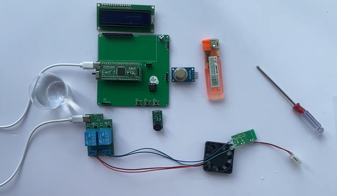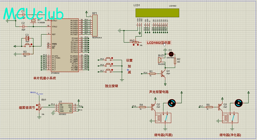 1、通过MQ-2模块检测烟雾值,当烟雾值大于设置最大值时开启风扇和净化器,同时进行声光报警提醒