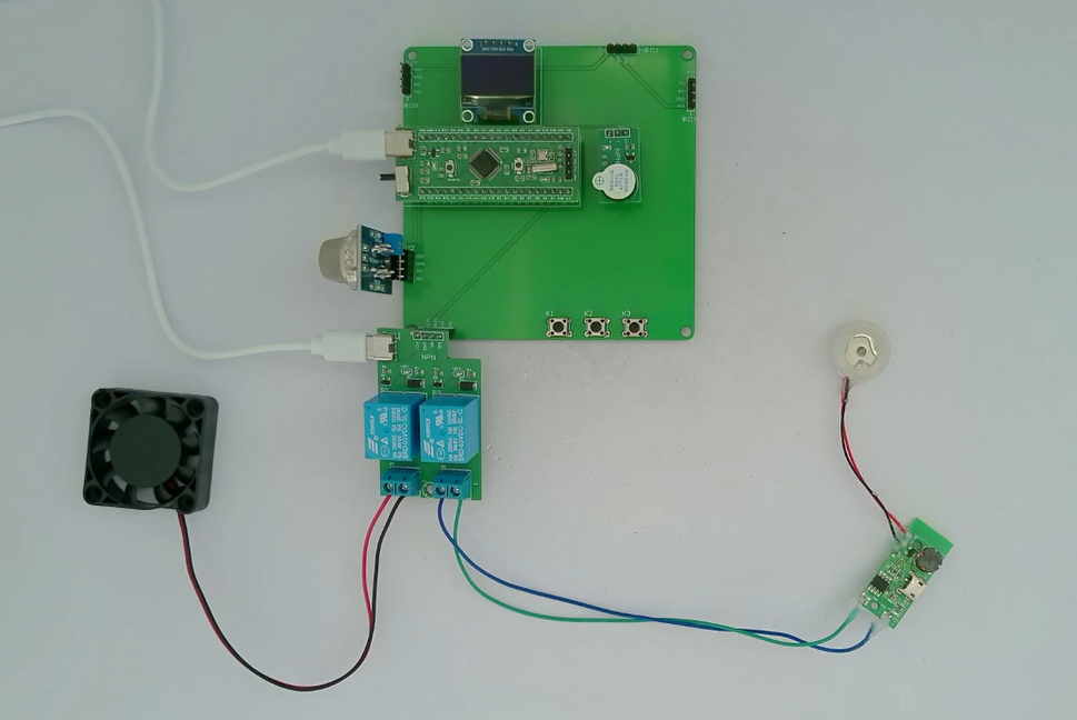 2、通过按键设置烟雾最大值,另外,当烟雾值小于等于设置最大值时,可手动控制风扇或净化器开关