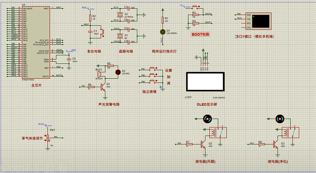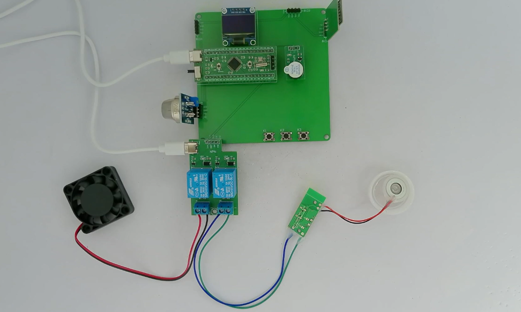 1、通过MQ-135模块检测苯气体值,当苯气体值大于设置最大值时开启风扇和净化器,同时进行声光报警提醒