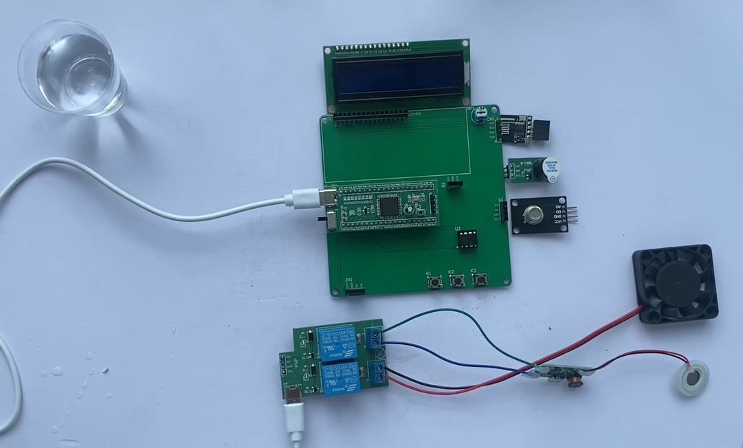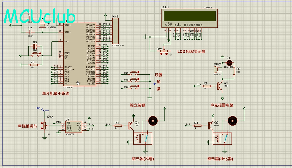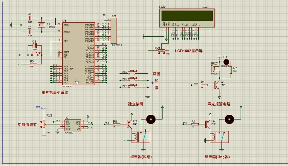 1、通过MS1100模块检测甲醛气体值,当甲醛气体值大于设置最大值时开启风扇和净化器,同时进行声光报警提醒