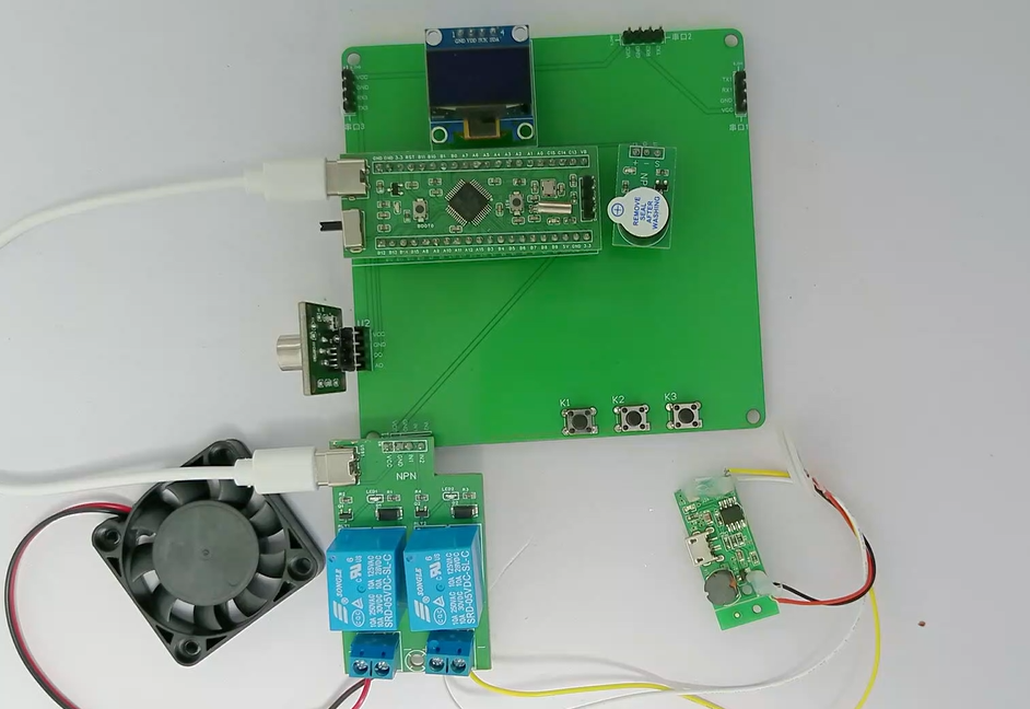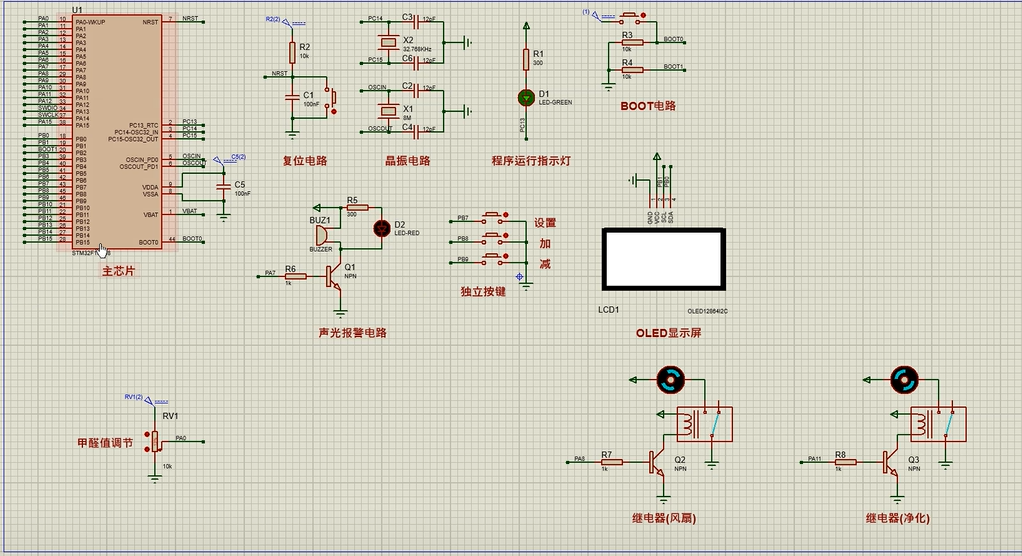 1、通过MS1100模块检测甲醛气体值,当甲醛气体值大于设置最大值时开启风扇和净化器,同时进行声光报警提醒