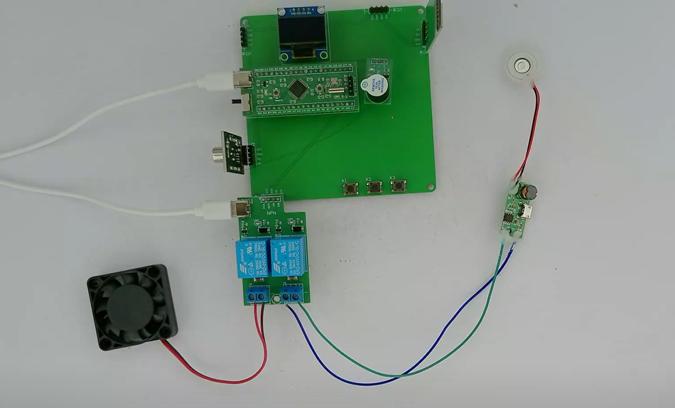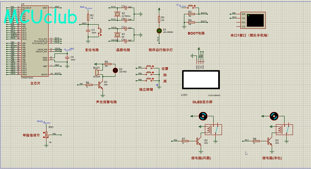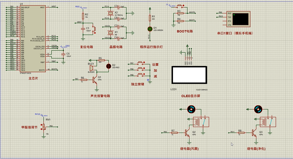 1、通过MS1100模块检测甲醛气体值,当甲醛气体值大于设置最大值时开启风扇和净化器,同时进行声光报警提醒