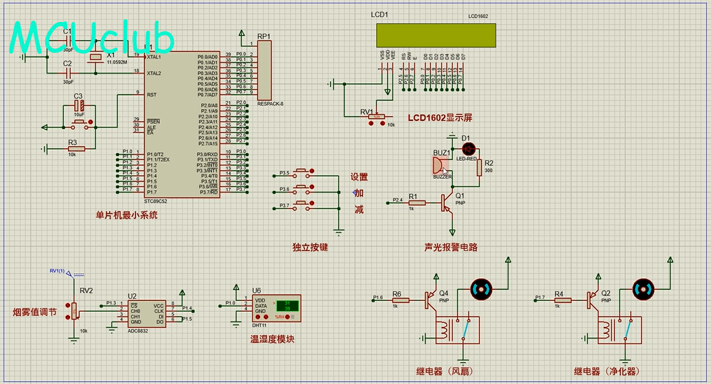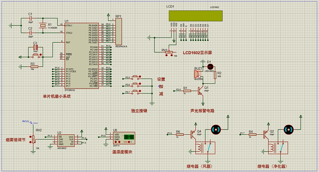 3、通过按键设置温湿度上下限值及烟雾最大值,另外,当烟雾值小于等于设置最大值时,可手动控制风扇或净化器开关