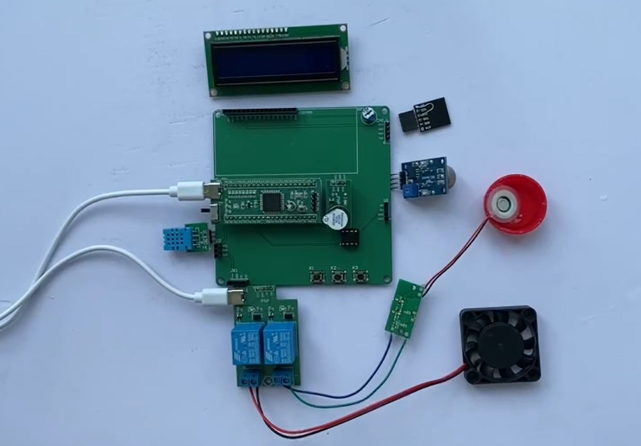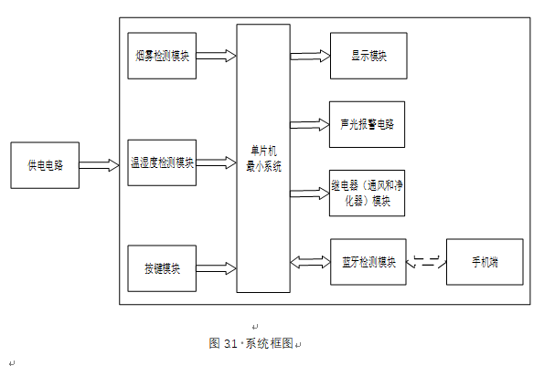 2、通过MQ-2模块检测烟雾值,当烟雾值大于设置最大值时开启风扇和净化器,同时进行声光报警提醒